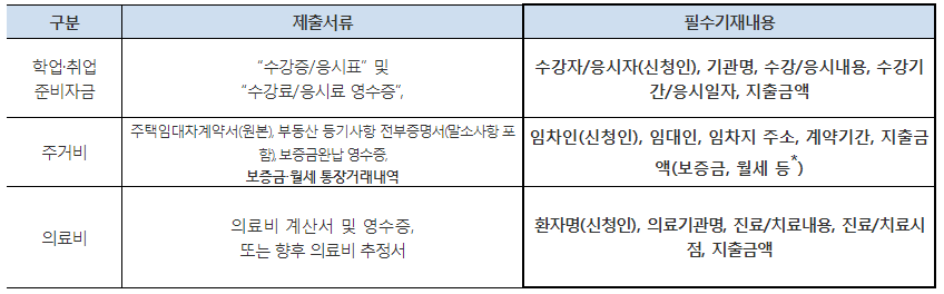 - 자금용도 확인서류 상 이용자 및 지출자가 보증신청인 본인인 경우에만 인정(가족 명의의 임대차계약, 가족 의료비 등은 모두 불인정)