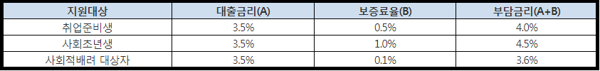기본적으로 정부지원 정부지원 햇살론 유스(youth)의 금리는 [대출금리+보증료율]의 식으로 계산하여 정해지고 있으며, 취업준비생의 금리는 4.0%, 사회초년생의 경우 4.5%, 사회적배려 대상자일 경우 3.6%로 산정되고 있습니다.