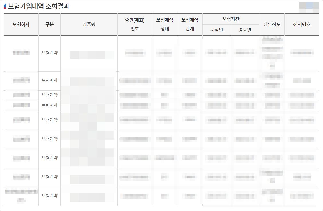 이곳에서는 현재 보험계약이 유지되고 있는 보험들과 3년 이내에 만기 또는 해지가 된 보험계약들을 확인할 수 있습니다. 한 마디로 내가 현재 국내에서 가입한 모든 보험내역을 확인할 수 있습니다.