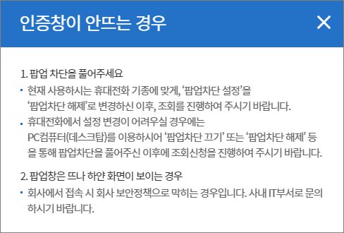만약, 인증창이 뜨지 않는다면, 위 사진에 안내되어있는 방법(팝업 차단 해제 등)을 시도해보시기 바랍니다.