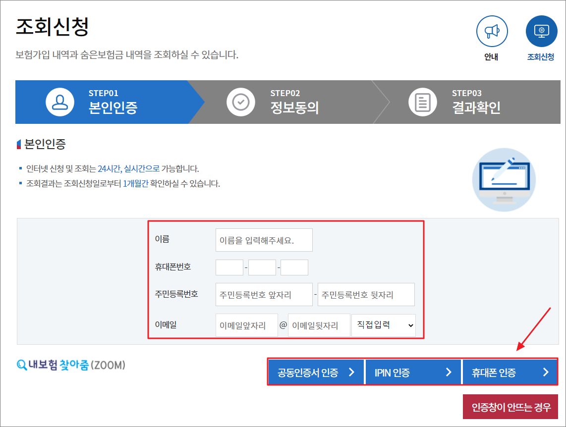 본인인증 과정을 위해 인적사항을 입력한 후, 공동인증서(구, 공인인증서), IPIN 인증, 휴대폰 인증 중에서 편하신 방법으로 본인인증을 진행하시면 되겠습니다.