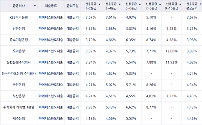 마이너스통장 금리는 신용등급에 따라 다르며 당연히도 신용등급이 좋다면 금리는 낮아지고 높다면 금리는 높아집니다. 신용등급에 따른 마이너스통장 금리가 얼마나 되는지 알아보겠습니다.