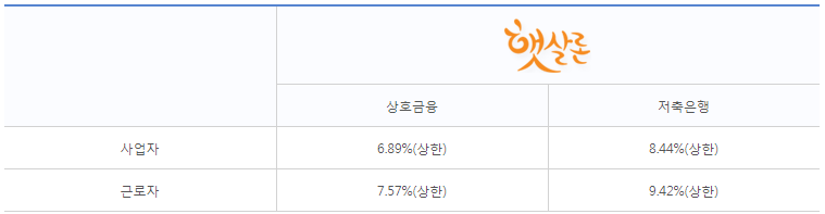 금리사항은 조달금리(1년만기 정기예금)에 따라 변동이 가능합니다. 현재 상호금융 사업자는 상한 6.89% 근로자는 상한7.57% 금리를 적용받고 있습니다. 저축은행은 사업자 상한 8.44%, 근로자 상한9.42% 금리를 적용받고 있습니다.
