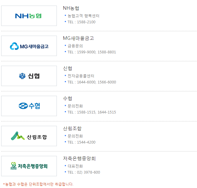 NH농협, MG새마을금고, 신협, 수협 산립조합, 저축은행중앙회를 통해 가능하며, 농협과 수협은 단위조합에서만 취급하고 있음.