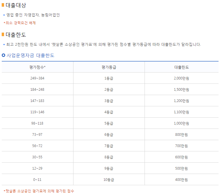 ⊙ 최고 2천만원 한도 내에서 '햇살론 소상공인 평가표'에 의해 평가된 점수별 평가등급에 따라 대출한도가 달라집니다.