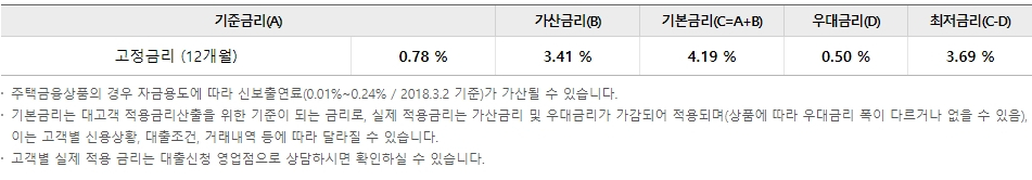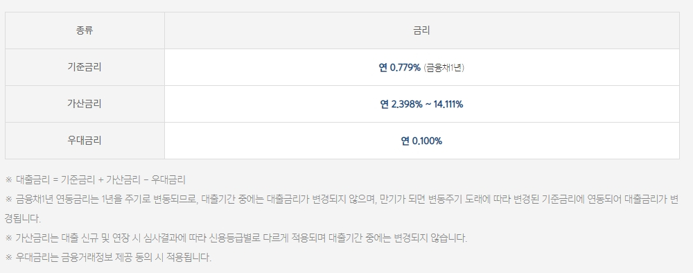 위의 금리 같은 경우 정확한 금리는 아니며 개인의 신용등급이나 여러 가지 상황을 보고 난 뒤에 정해지는 금리로써 기준금리인 연 0.779%에서 가산금리가 더해져 적용이 되게 됩니다. 그리고 우대금리를 통하여 금리를 낮출 수도 있습니다.