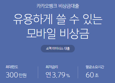 카카오 뱅크 애플리케이션을 통해서 신청하는 모바일 대출 상품이며 최대 60초 안으로 가능 여부를 확인하고 최대 300만 원까지 한도가 부여됩니다.
